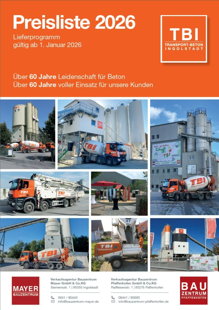Die TBI gehört seit 1962 zu den Pionieren des Transportbetons. An fünf TBI-Standorten in Ihrer Nähe wird Ihnen mit 30 Fahrmischern und 4 Beton- und 2 Estrichförderpumpen eine flächendeckende Versorgung jeder Baustelle im Großraum Ingolstadt-Süd und -Nord, Neuburg, Neustadt und Pfaffenhofen gewährleistet.
